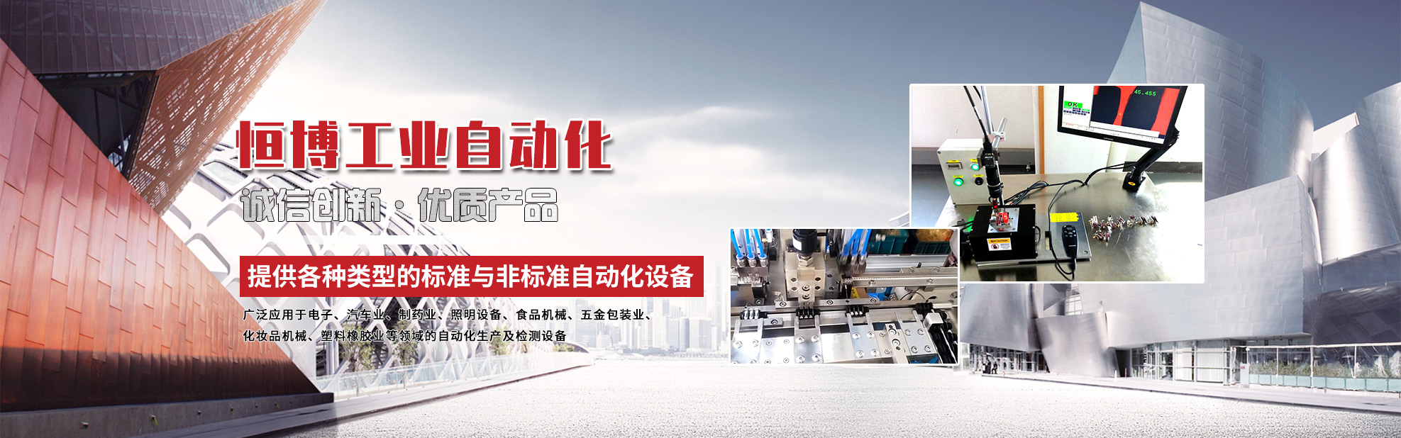 恒博工業自動化研發的設備,廣泛應用于電子、汽車業、制藥業、照明設備、食品機械、五金包裝業、化妝品機械、塑料橡膠業等領域的自動化生產及檢測設備,根據客戶需求自主研發與設計,主要提供各種類型的標準與非標準連接器、接線端子和五金電子元器件等產品自動化組裝、加工機械設備和各類工裝治具設計制作及一攬子技術支持服務與解決方案,在為你節省成本的同時節省時間。